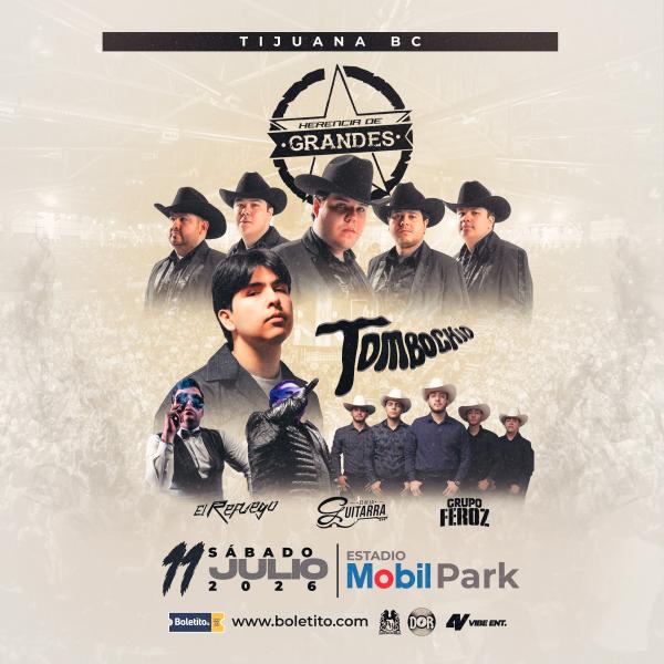 Descripción:¡Prepárate para vivir una noche inolvidable con HERENCIA DE GRANDES, TOMBOCHIO, EL REFUEGO, EL DE LA GUITARRA Y GRUPO FEROZ en TIJUANA este 11 de julio 2026!